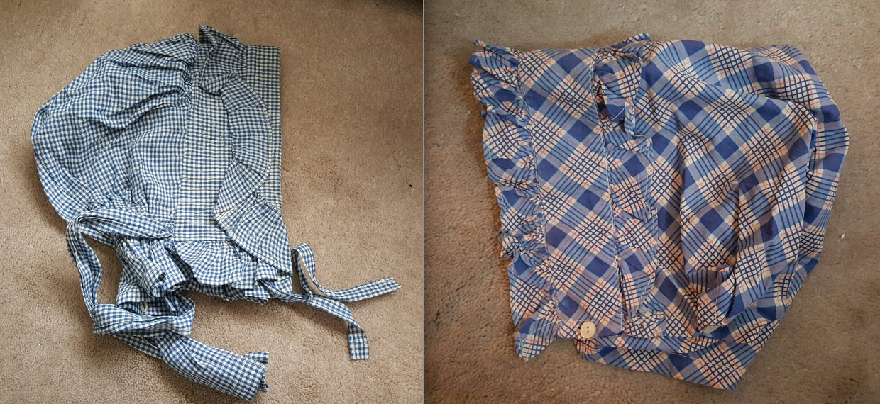 Sunbonnets come in many different styles. The blue gingham bonnet shows wear but has held up well for over 100 years. It has cloth ties, a large brim, a flounce at the back and sides and narrow pockets inside for placing cardboard as stiffening.