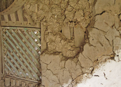 Construction using mud and stud is unique to Lincolnshire. It is similar to wattle and daub but the mud is supported by upright oak posts or studs nailed to cross rails. The whole framework is covered with a daub (dirt with chopped straw and water).The cottages were painted with white lime-wash mixed with animal fat for weatherproofing. Lime-wash would have to be reapplied at least bi-annually. Roofs were of thatch Most were built one and a half stories high with a central hearth. The upper rooms were accessible by ladder.